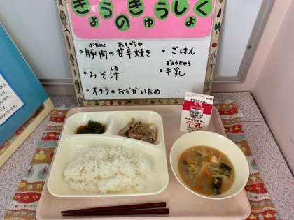 豚肉の甘辛焼き、みそ汁、オクラのおかかいため、ごはん、牛乳