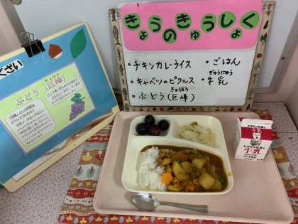 チキンカレーライス(米粉)、キャベツのピクルス、ぶどう(巨峰)、牛乳