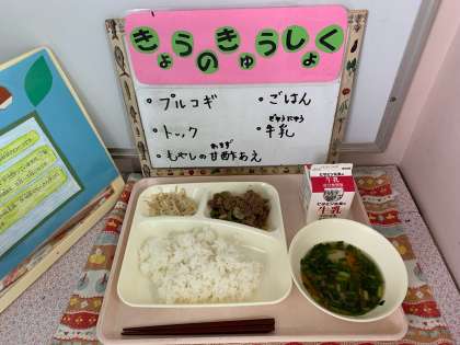 プルコギ、トック、もやしの甘酢あえ、ごはん、牛乳