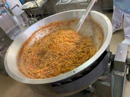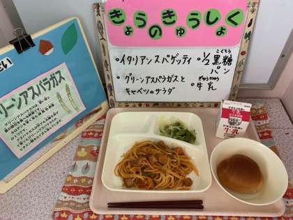 イタリアンスパゲッティ、グリーンアスパラガスとキャベツのサラダ、黒糖クレセントロールパン、牛乳