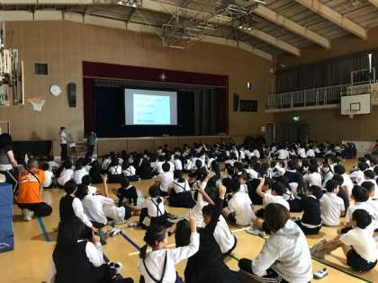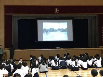 今日の集会は、来週の月曜日に行われる縦割り全校遠足のコースの説明が行われました。