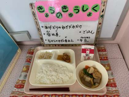 あげどりのねぎだれかけ、含め煮、もやしのゆずの香あえ、ごはん、牛乳