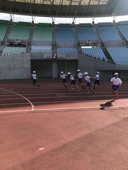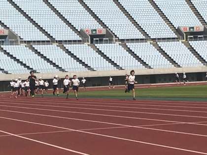 6年生がスポーツ交歓会のため、長居陸上競技場に行きました。午前は陸上競技を行いました。