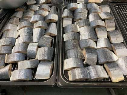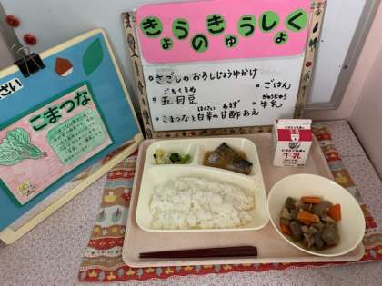 さごしのおろしじょうゆかけ、五目豆、こまつなとはくさいの甘酢あえ。ごはん、牛乳