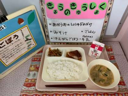 あかうおのしょうゆだれかけ、みそ汁、きんぴらごぼう、ごはん、牛乳