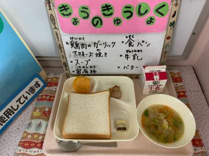 鶏肉のガーリックマヨネーズ焼き、スープ、かき(富有柿)、食パン、バター、牛乳