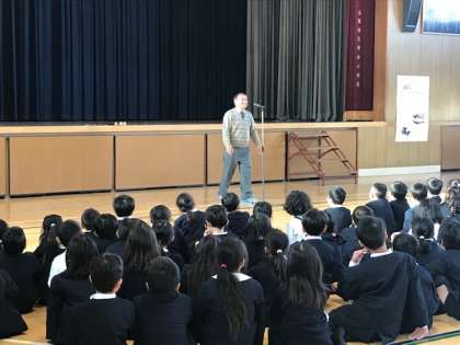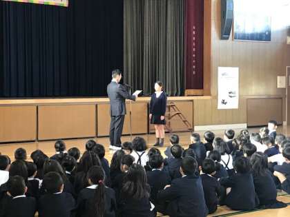 はじめに校長先生からのお話がありました。続いて、今週の金曜日に行われる「友だちの国の遊びをしよう」について担当の先生からのお話がありました。続いて、今週の担当の先生から生活目標のお話があり、最後に校長先生から親子クッキングの表彰がありました。
