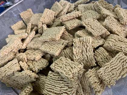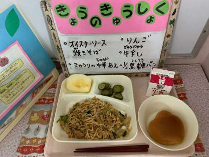 オイスターソース焼きそば、きゅうりの中華あえ、りんご、黒糖クレセントロールパン、牛乳