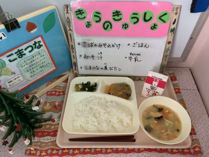 さばのみぞれかけ、みそ汁、こまつなの煮びたし、ごはん、牛乳