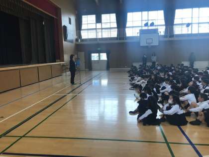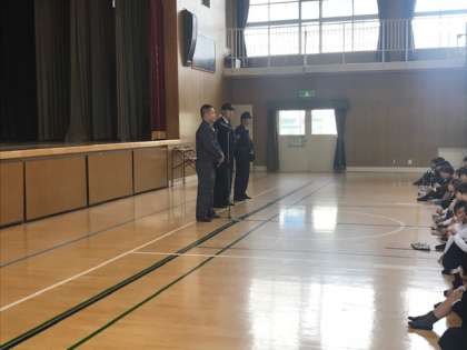港警察のかたがこられて、不審者対応のための防犯訓練を行ってくれました。訓練のあとには、警察のかたからのお話がありました。