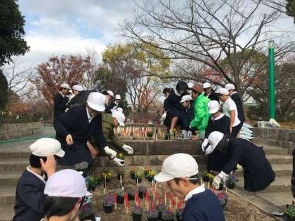 6年生が八幡屋公園に卒業花壇の作成に行きました。公園の職員の方や地域のボランティアの方に協力していただき、とてもきれいな花壇が出来上がりました。