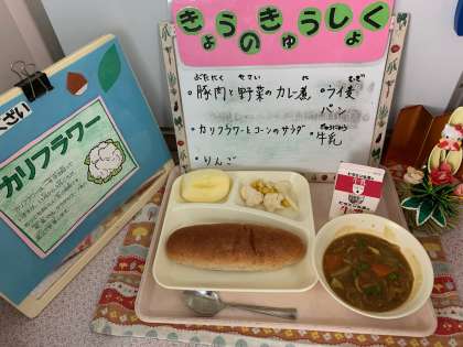 豚肉と野菜のカレー煮、カリフラワーとコーンのサラダ、リンゴ、ライ麦パン、牛乳