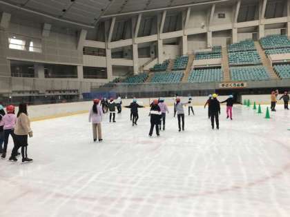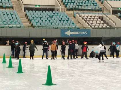 3〜6年生が大阪プールのアイススケートリンクでアイススケート体験をしました。インストラクターの先生から滑りかたを教えてもらい、楽しくスケートができました。