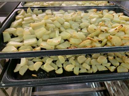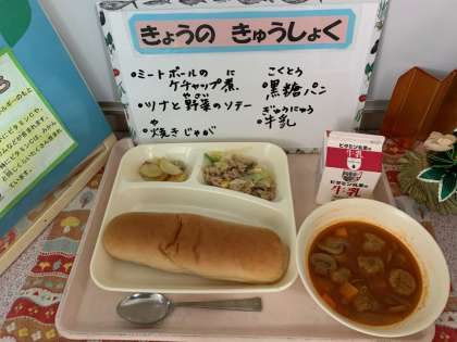 ミートボールのケチャップ煮、ツナと野菜のソテー、焼きじゃが、黒糖パン、牛乳