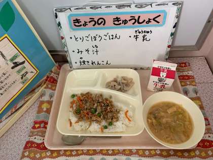 鶏ごぼうご飯、みそ汁、焼きれんこん、牛乳
