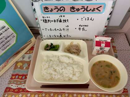 鶏肉のゆず塩焼き、さつまいものみそ汁、こまつなの煮びたし、ごはん、牛乳