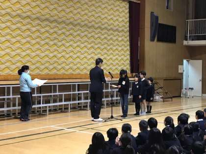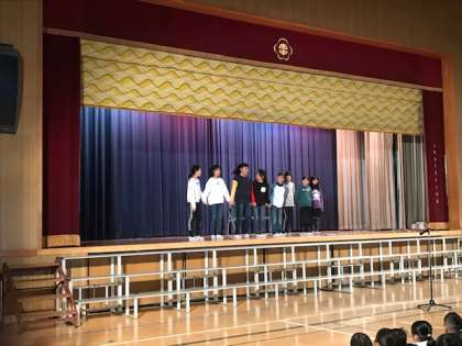 はじめに絵画コンクールの表彰があり、そのあとに校長先生と今週の当番の先生のお話がありました。その後に、今日は劇クラブの発表がありました。