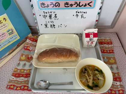 中華煮、黒糖パン、牛乳