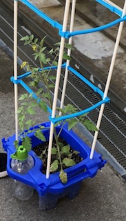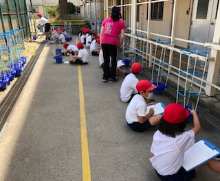 →鉢植えで育てているトマトの観察をしていました。順調に育ち、黄色い花や小さい実をつけ始めています。これからが楽しみですね!