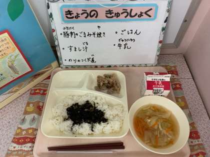 豚肉のごまみそ焼き、すまし汁、のりのつくだ煮、ごはん、牛乳