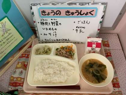 豚肉と野菜のいためもの、みそ汁、キャベツの赤じそあえ、ごはん、牛乳