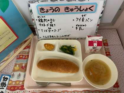 鶏肉のカレーマヨネーズ焼き、てぼ豆のスープ、さんどまめとコーンのサラダ、ライ麦パン、牛乳