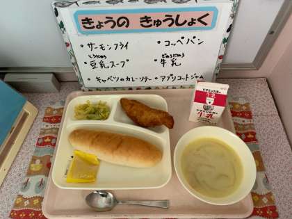 サーモンフライ、豆乳スープ、キャベツのカレーソテー、コッペパン、アプリコットジャム、牛乳