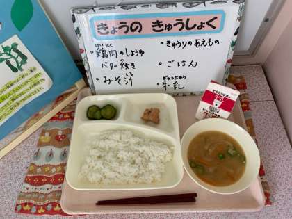 鶏肉のしょうゆバター焼き、みそ汁、きゅうりのあえもの、ごはん、牛乳