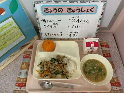 豚ミンチとニラのそぼろ丼、オクラのみそ汁、みかん(冷)、牛乳