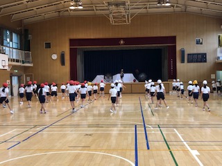 →講堂にて、体育の授業をしていました。準備運動からしっかり身体を動かして、元気に活動していました。
