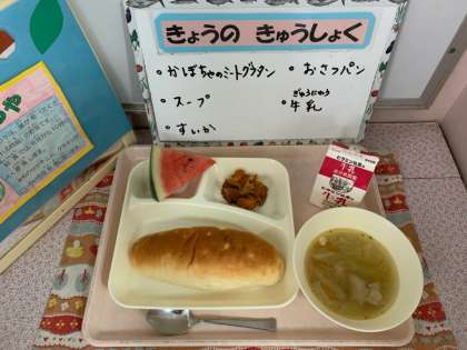 かぼちゃのミートグラタン、スープ、すいか、おさつパン、牛乳