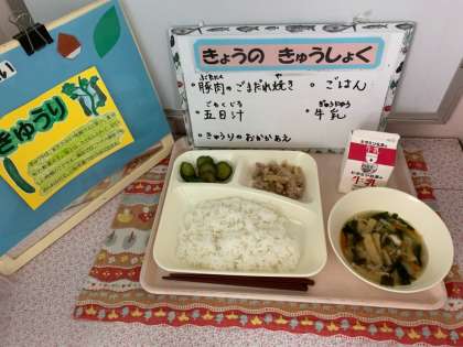 豚肉のごまだれ焼き、五目汁、きゅうりのおかかあえ、ごはん、牛乳