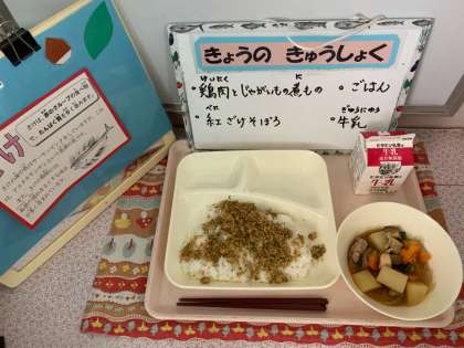 鶏肉とじゃがいもの煮もの、紅さけそぼろ、ごはん、牛乳