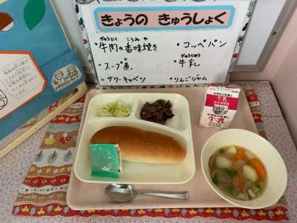 牛肉の香味焼き、スープ煮、サワーキャベツ、りんごジャム、牛乳