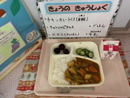 チキンカレーライス[米粉]、きゅうりのピクルス、ぶどう(巨峰)、牛乳