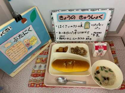 はくさいのクリーム煮、あつあげのピリ辛じょうゆかけ、豚肉とれんこんのオイスターソースいため、パンプキンパン、牛乳