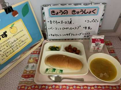 まぐろのオーロラ煮、ベーコンとじゃがいものスープ、きゅうりとコーンのゆずドレッシング、コッペパン、ソフトマーガリン、牛乳