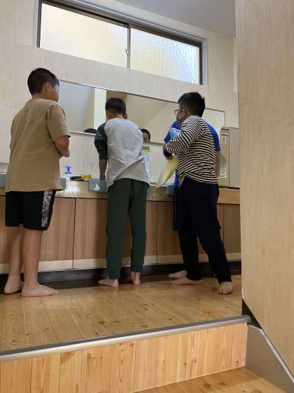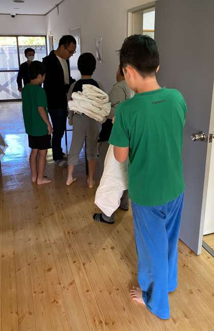 子どもたちは眠そうな目をこすりながらも、一生懸命寝具の片付けや洗面をしています。