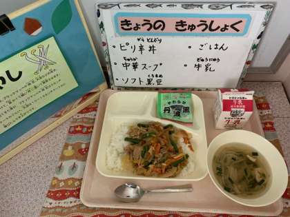 ピリ辛丼、中華スープ、ソフト黒豆、牛乳