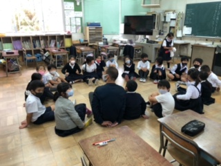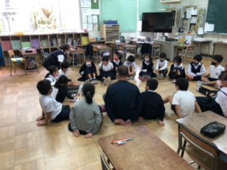 →今日はあいにくの雨で、運動場で遊べません。休み時間に教室で「みんな遊び」をする学級がありました。学級のみんなで楽しく「ハンカチ落としゲーム」をしていました。笑顔いっぱいで、とてもよい時間をすごしていました。