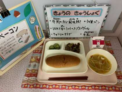 牛肉のカレー風味焼き、ほたて貝とトマトのスープスパゲッティ、きゅうりのサラダ、ライ麦パン、牛乳