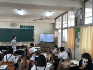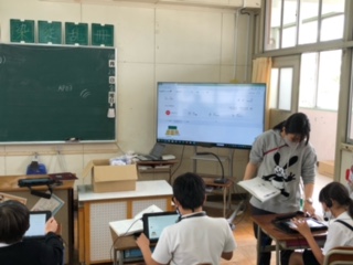 →6年生も同様に、支援員さんのアドバイス、サポートのもとで活動をしました。今回初めて英語のデジタルドリルにも取り組みました。ヘッドセットを使って、音声での学習も行いました。映像と音声での例文をまねて「Sure Hi! I,m 〜」と発音していました。今後の一人一台のタブレット端末の導入に向けて、引き続き準備を進めてまいります。