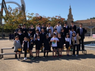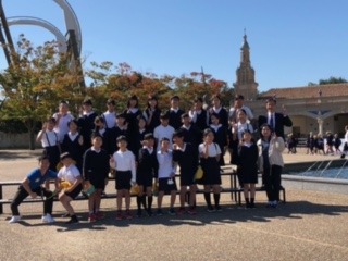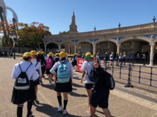 →最初の目的地の志摩スペイン村に到着しました。感染症対策のため、入口前ではなくバスの車内で、チケットやクーポンなどを子どもたちに配布しています。この後、検温等の健康チェックをして、園内に入ります。いよいよ活動スタートです!