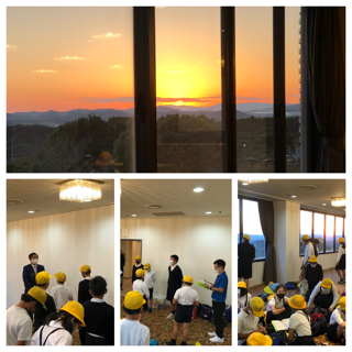 →ちょうど夕日が沈む前の綺麗な夕焼け空が見える部屋で、開舎式を行いました。児童代表がホテルの方に挨拶をして、マナー良く過ごすことを約束しました。