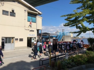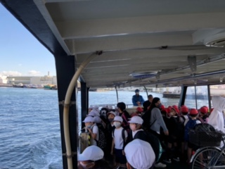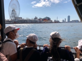 →渡し船に乗りました。少しの時間でしたが、船旅?を楽しみました。今回は対岸でおりず、往復して天保山公園に戻りました。