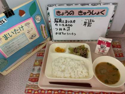 豚肉とまいたけのいためもの、つみれ汁、かぼちゃういろう、ごはん、牛乳