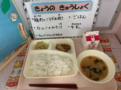 鶏肉のごまだれ焼き、なめこのみそ汁、キャベツのいためもの、ごはん、牛乳