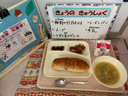豚肉のデミグラスソース、スープ、うずら豆のグラッセ、レーズンパン、牛乳