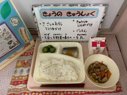 さごしのおろしじょうゆかけ、大豆と冬野菜の煮もの、きゅうりのしょうがづけ、ごはん、牛乳