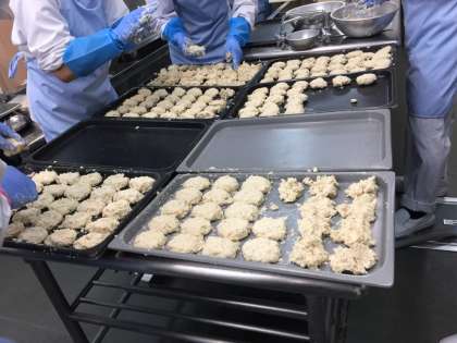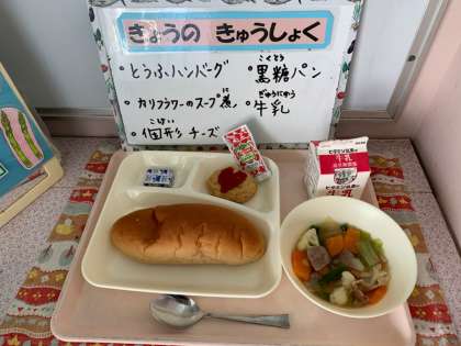 とうふハンバーグ、カリフラワーのスープ煮、固形チーズ、黒糖パン、牛乳